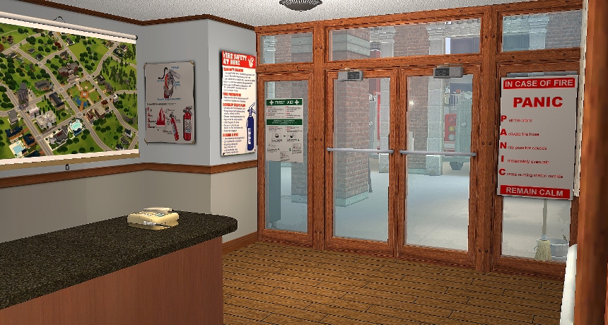That door leads out into the main garage area. After seeing an episode of that tv show Rescue Me, I saw that the fire fighters had a bunch of tools, workbenches and even a locker room fairly close to where they load onto the fire trucks to put on/take off their gear before and after emergencies, so I added those areas.